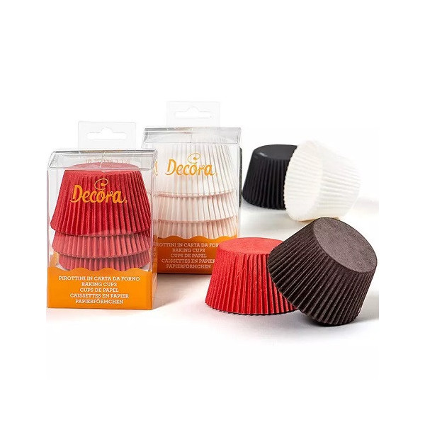 Pirottini neri rossi in carta forno antiaderente, resistente fino a 220 °C, per: muffin ø5xh3,2 cm o jumbo muffin ø5,5xh4,5 cm. Ideali per cuocere e presentare piccoli dolcetti.