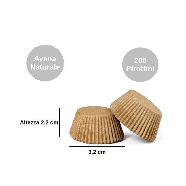 100 Pirottini bonbon avana naturale in carta forno antiaderente, resistente fino a 220 °C, diametro 2,7 cm altezza 1,7 cm. Ideali per cuocere e presentare piccoli dolcetti.