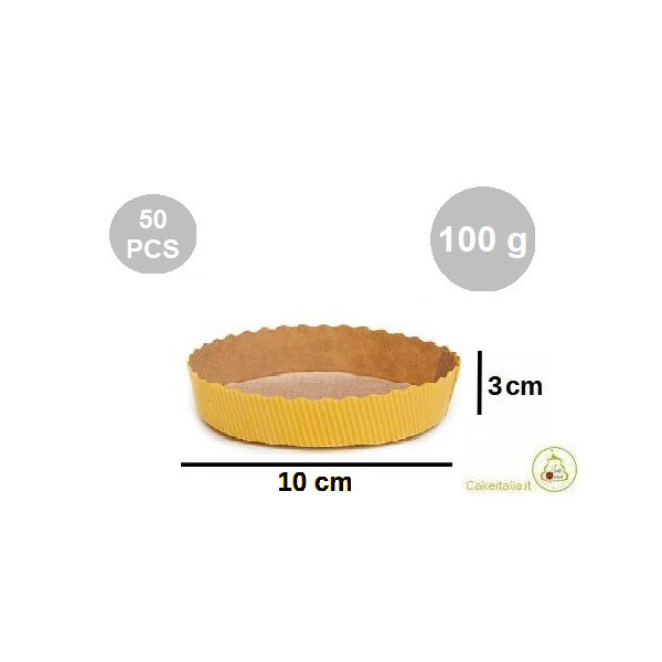 Set 50 Pirottini per tortine o crostatine grandi da 100 g, diametro 10 cm ed altezza 3 cm, in carta forno monouso gialla.