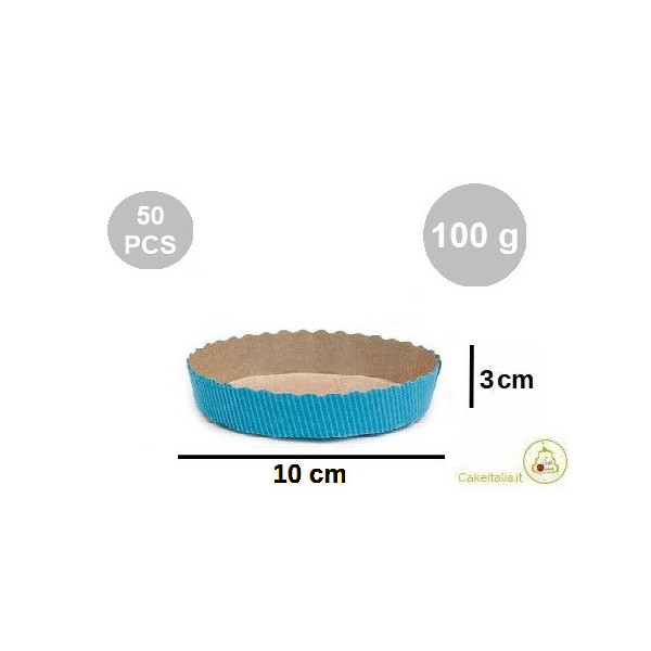 Set da 50 pirottini in carta forno blu, ideali per crostatine, mini torte e monoporzioni da 100 g, di dimensioni Ø10×H3 cm. Resistenti al forno, monouso e pronti all’uso. Perfetti per crostatine, tortine e dolci monoporzione.