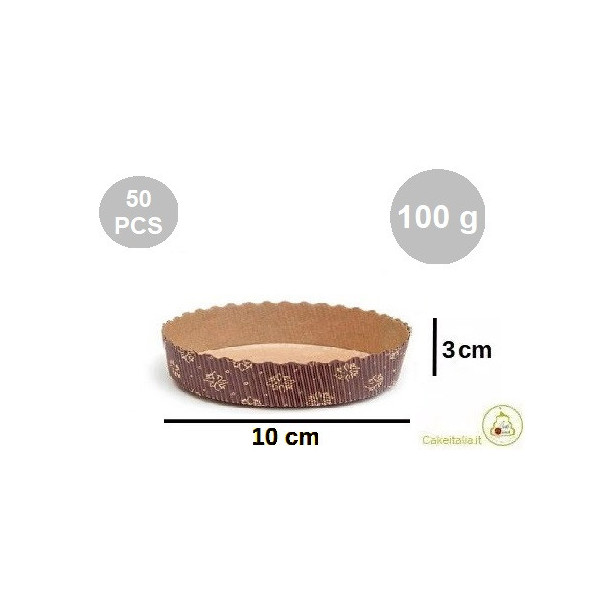 Set 50 Pirottini per tortine o crostatine grandi da 100 g, diametro 10 cm ed altezza 3 cm, in carta forno monouso marrone.