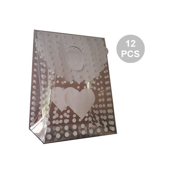 Scatola grande a forma di sacchetto regalo, in plastica morbida, PVC, trasparente con pois e decoro cuore bianco in confezione da 12 o 24 scatoline.