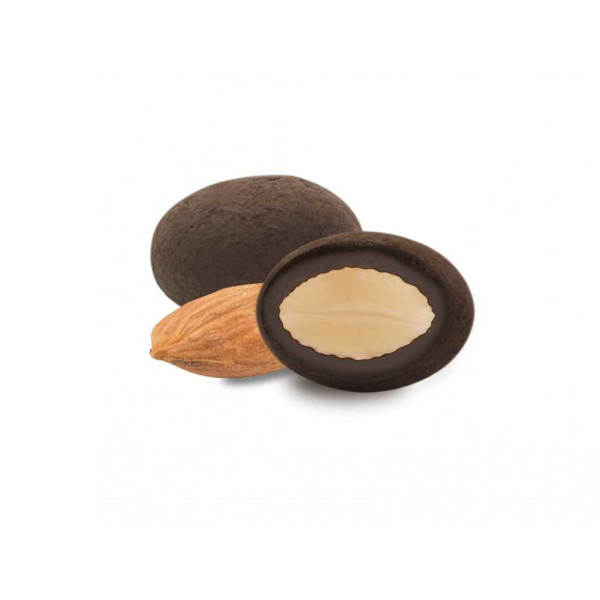 Mandorla tostata ricoperta di cioccolato fondente e tartufata con polvere di cacao.
