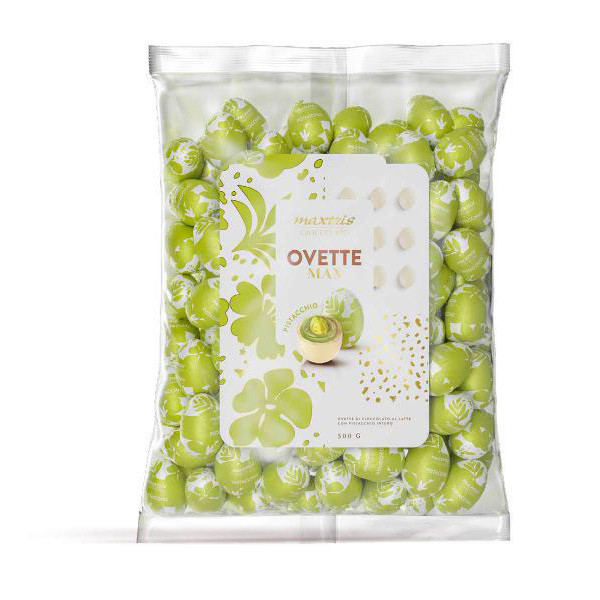 Ovette di cioccolato bianco con pistacchio intero tostato e morbido ripieno al cioccolato bianco e pasta di pistacchio.