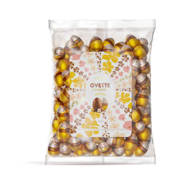 Ovette di cioccolato al latte con nocciola intera tostata e morbido ripieno al cioccolato al latte e pasta di nocciola.