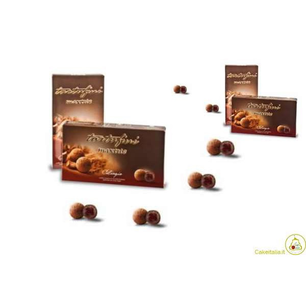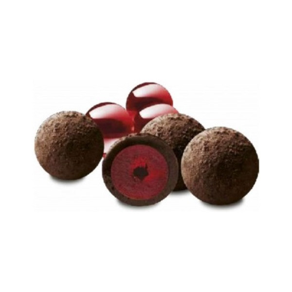 Praline Maxtris Tartufini Ciliegia in confezione da 500 g: morbido tartufino, con ciliegia, amarenizzata, candita intera, ricoperta di cioccolato fondente e cacao magro in polvere.
