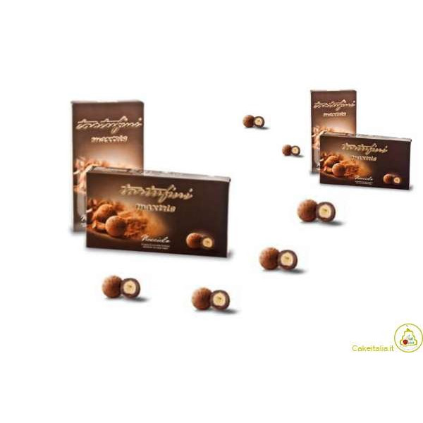 Vassoio Maxtris Tartufini Mandorla Gianduia Incartati singolarmente 500 g: mandorla tostata ricoperta di cioccolato al latte e alle nocciole gianduia e tartufata con polvere di cacao.