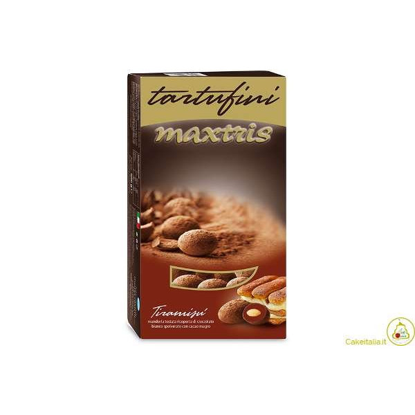 Praline Maxtris Tartufini Tiramisù in confezione da 500 g: morbido tartufino, con mandorla tostata, ricoperta di cioccolato bianco aromatizzato alla crema gusto tiramisù e tartufata.