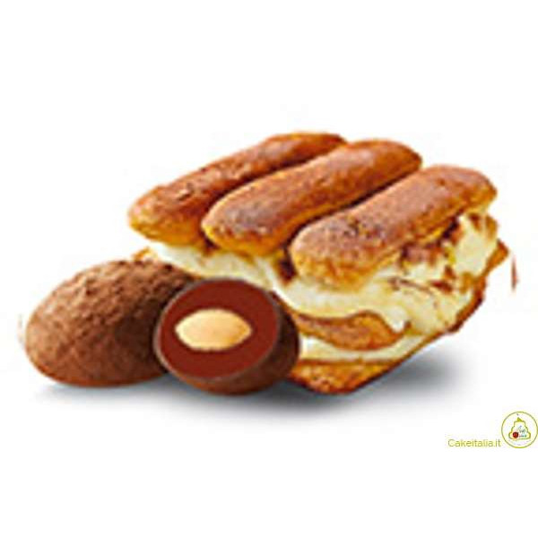 Confetti pralinati tipo tartufino morbidi, con Mandorla tostata, cioccolato bianco al gusto tiramisù e zucchero a velo.