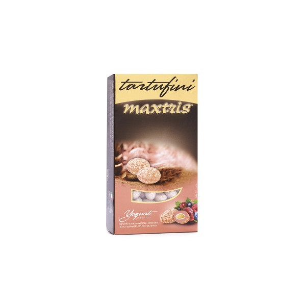 Praline Maxtris Tartufini Yogurt ai Frutti di Bosco da 500 g: morbido tartufino color cacao, con mandorla tostata, ricoperta di cioccolato bianco aromatizzato al gusto Yogurt ai Frutti di Bosco ed avvolto da uno strato di cacao magro.