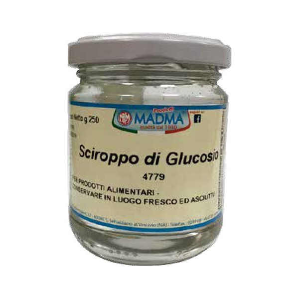 Sciroppo di glucosio liquido in barattolo da 250 g, da Madma, utilizzato in preparazioni dove è necessaria maggior plasticità e volume. Ideale nella preparazione di gommosi, fondant, gelati e sorbetti e caramelle in genere.
