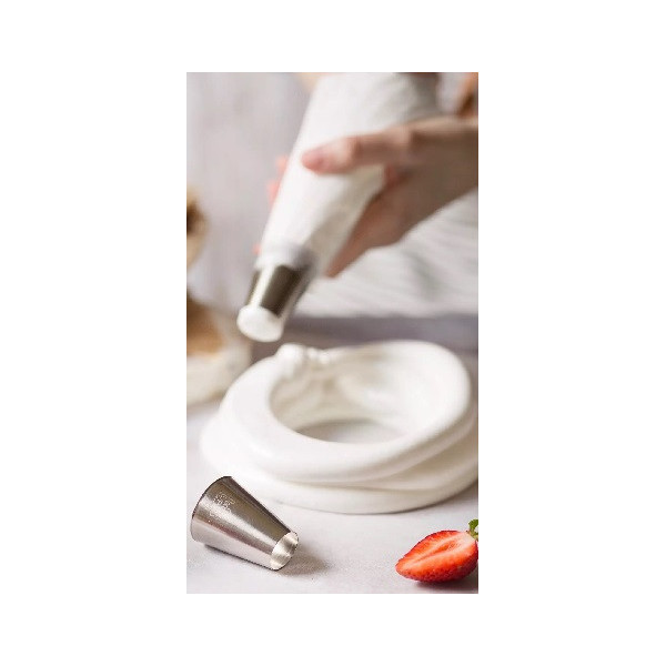 Cornetto speciale n 402 Merletto in acciaio inox Decora: bocchetta per decorazioni a strisce ondulate e merletti su torte e dolci, con crema e panna. Il beccuccio Merletto n 402 è in acciaio adatto all'uso alimentare, senza punti di saldatura, lavabile in lavastoviglie e riutilizzabile.