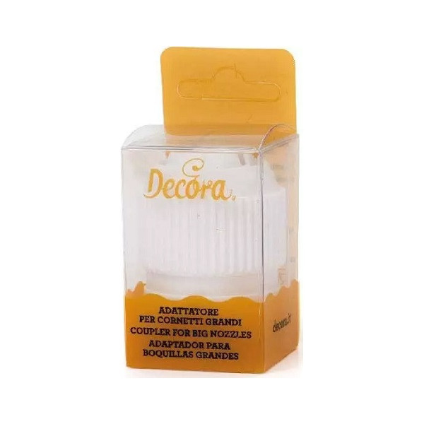 Adattatore per cornetti 3D, pratico per cambi veloci dei cornetti alla sac à poche senza svuotarla, con cappuccio di chiusura salva freschezza, in plastica bianca per alimenti da Decora.