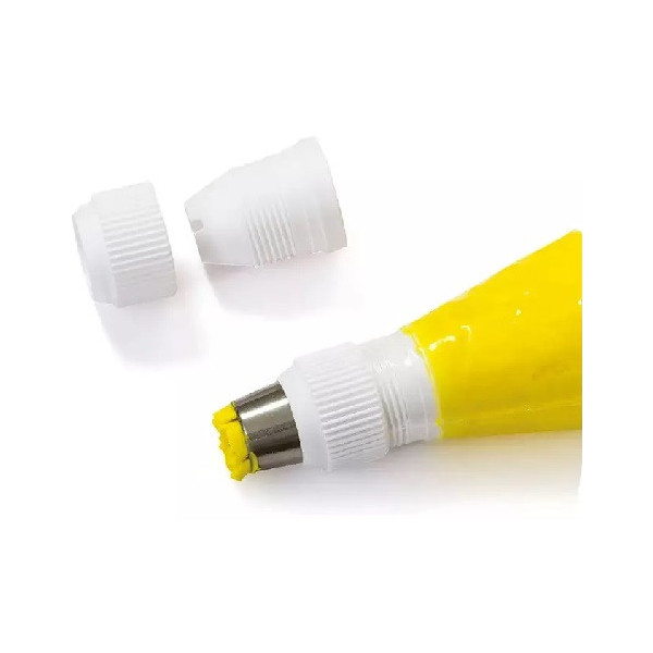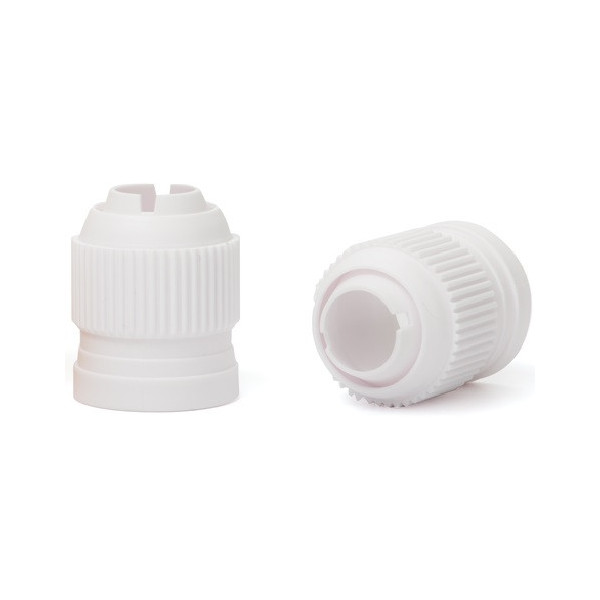 Set si 1 o 12 adattatori per cornetti standard, pratici per cambi veloci dei cornetti alla sac à poche senza svuotarla, grazie al cappuccio di chiusura salva freschezza, in plastica bianca per alimenti da Decora.