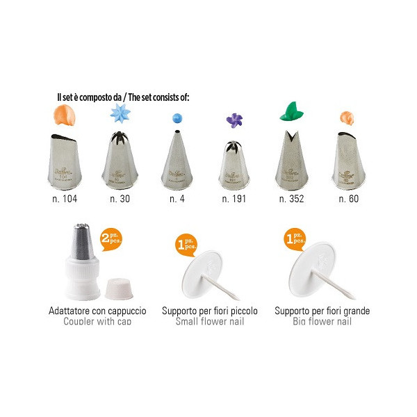Un set di 10 pezzi, da utilizzare con la sac à poche, infatti oltre alle 6 bocchette da decorazione, ci sono gli adattatori con cappuccio e completa il kit gli spilloni in plastica per la decorazione di fiori grandi e piccolo.