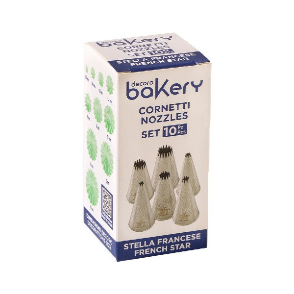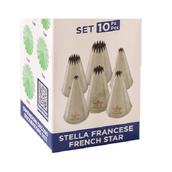 Set 10 cornetti stella francese in acciaio inox dal diametro 4 a 18 mm Decora: kit di 10 bocchette stella francese, professionali, senza punti di saldatura, da utilizzare senza adattatore.