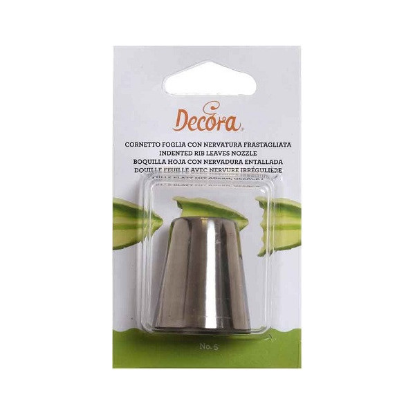 Cornetto foglia con nervatura frastagliata in acciaio inox Ø 3,5 x 4 cm Decora: beccuccio o bocchetta n. 5 per fiori 3D da decorazione diretta su torte e dolcetti, senza punti di saldatura, riutilizzabile.