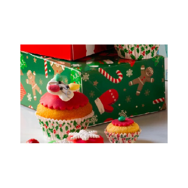 Pratico box auto-montante, in cartone per alimenti, di dimensioni 18x13,5xh7,5 cm, l'elegante decoro che richiama l'omino Gingerbread e altri decori natalizi lo rendono perfetto per confezionare e regalare dolci pensierini fatti in casa, nel periodo natalizio.