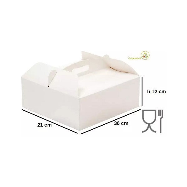 Scatola rettangolare per torta e dolci, in cartoncino bianco, con manico ed alette di 21x36xh12 cm per uso alimentare, imbustata singolarmente da Decora.