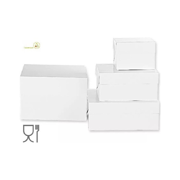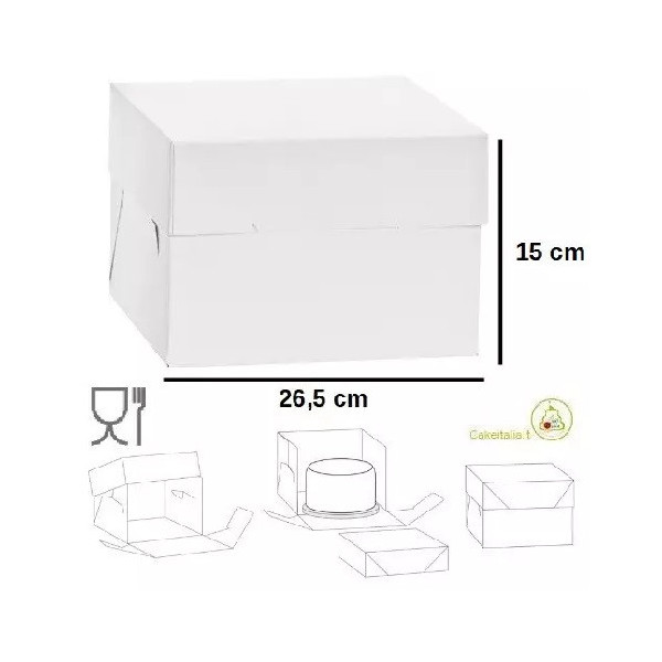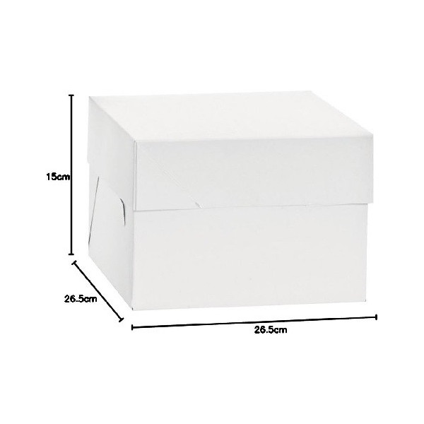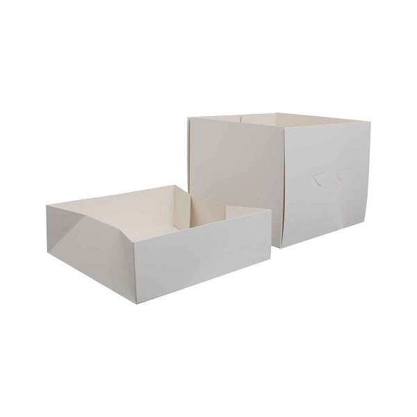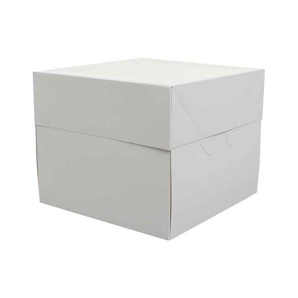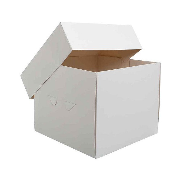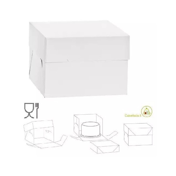 Scatola per torte alte, con coperchio e base quadrata di lato da 26,5 a 50,5 cm in cartoncino bianca per uso alimentare, imbustata singolarmente, ideale per trasportare e conservare dolci o torte.