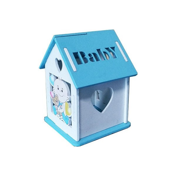Scatolina in legno a forma di casetta celeste con bimbo paffuto: scatolina portaconfetti bimbo, decorata ai lati con bimbo neonato paffuto con orsacchiotto