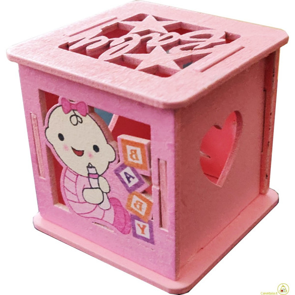 Scatolina in legno Rosa con neonata paffuta: cubo in legno rosa, ai lati con decoro bimba neonata paffuta con biberon, ideale portaconfetti per nascita bimba.