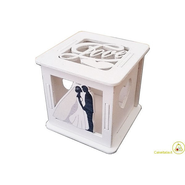 Cubo in legno bianco ai lati con decoro sposi, foro a forma di e cuore, e scritta love, ideale portaconfetti per matrimonio.