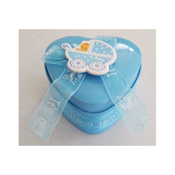 Scatolina in metallo a forma di cuore, decorata con nastrino in organza con scritta "It's a boy" e placca decorativa