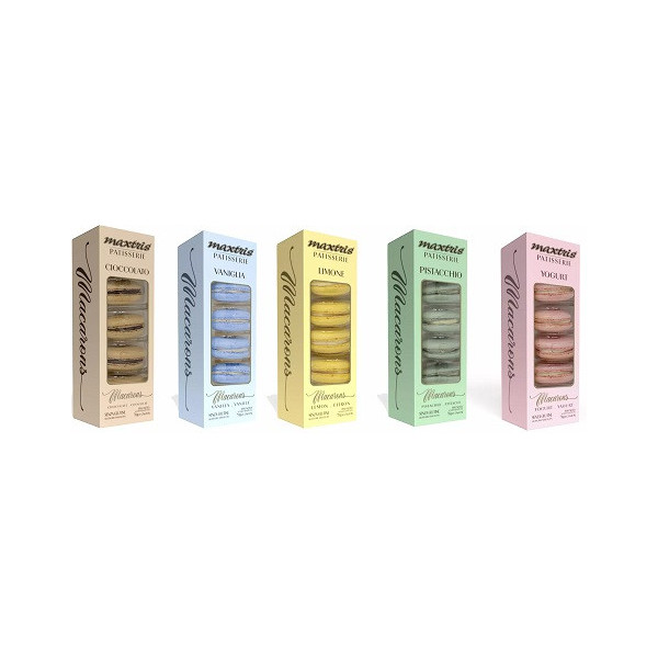 Kit Macarons Maxtris 5 gusti e 5 colori: morbide meringhe con farina di mandorle e un goloso ripieno al gusto cacao, limone, pistacchio, yogurt e vaniglia, da Maxtris Patisserie.