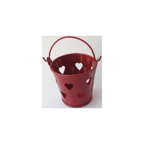 Piccolo secchiello in metallo di colore bordeaux, con fori a forma di cuore. ideale come portaconfetti o per creare bomboniere.