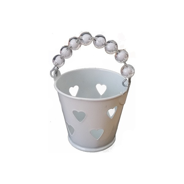 Mini Secchiello portaconfetti bomboniera Bianco con decoro cuore e manico con perline in plastica trasparente
