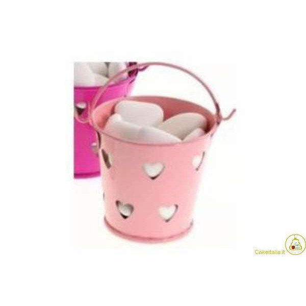 Piccolo secchiello in metallo di colore rosa, con fori a forma di cuore. ideale come portaconfetti o per creare bomboniere.
