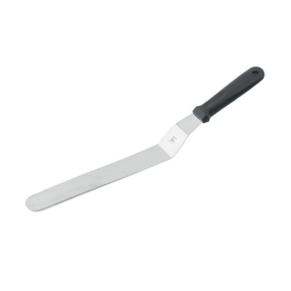 Usa la spatola angolare, con lama piatta e liscia, in acciaio flessibile con impugnatura in plastica nera per spostare dolci e spalmare creme, cioccolato e ghiaccia sulle torte.