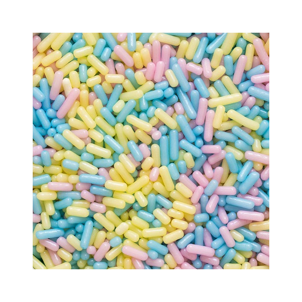 Barattolino da 100 g, con tappo di chiusura, di bastoncini di zucchero nei colori rosa, azzurro e giallo, ideali per decorare torte e dolci e vivacizzare le tue creazioni.