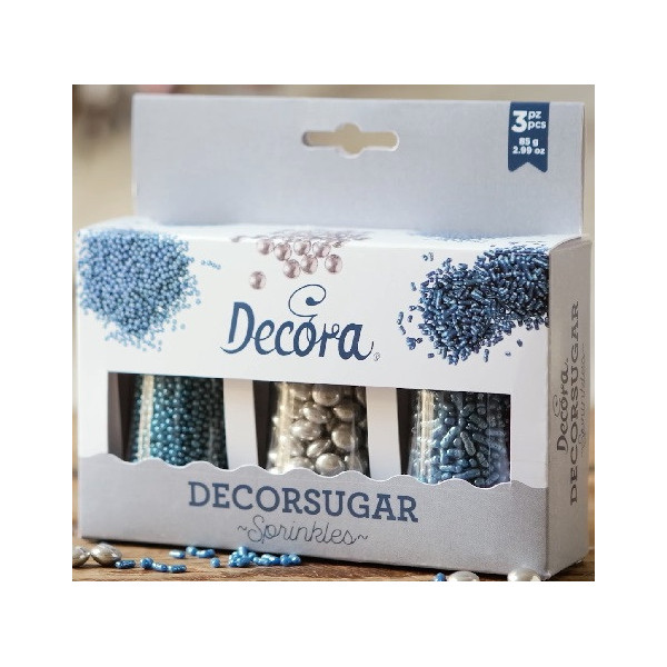 Set Decor Mix argento e azzurro metallizzato Decora 85 g: 25 g di lenti argento ø 10 mm, 30 g di perline azzurro ø 2 mm e 30 g bastoncini azzurro 5 x 2 mm. Cospargi direttamente su torte, cupcakes e biscotti e vivacizza le tue creazioni.