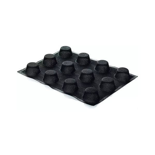stampo 30x40 cm in silicone nero e fibra di vetro microforato per tartellette tonde, vuote o ripiene o tortini o monoporzioni tonde.