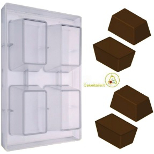 - 1 stampo lingotto piccolo del peso 285 g, per realizzare 4 contenitori o lingotti di cioccolato di lunghezza 93,5 mm x 65,5 mm x altezza 53 mm,