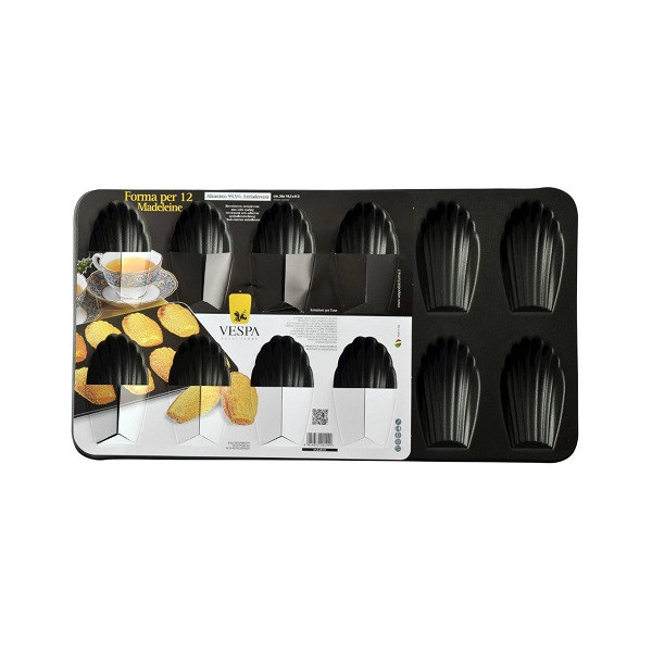 Stampo madeleine teglia in metallo antiaderente 12 maddalene 7,2x4,5xh1,6 cm Vespa. Teglia a vassoio o a plateau, in metallo antiaderente per 12 forme madeleine o maddalene da Vespa dolci forme.