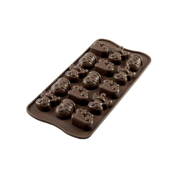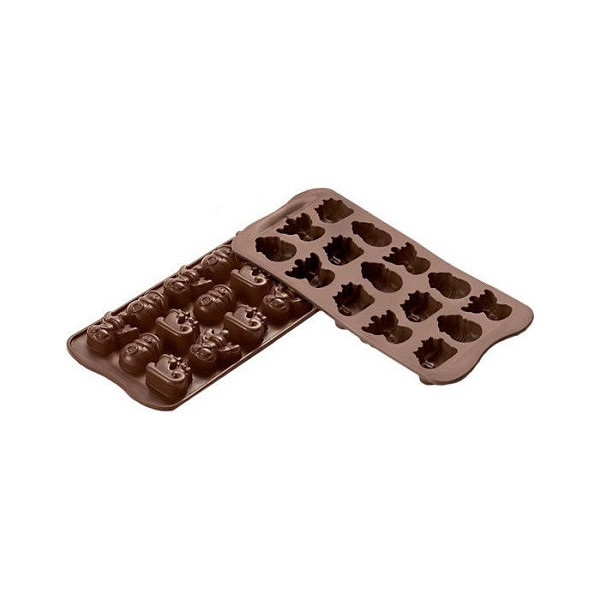 Stampo Choco Winter o cioccolatini Natalizi SCG23 da Silikomart: stampo in silicone marrone, per 15 cioccolatini a forma di renna, slitta o pupazzo di neve.