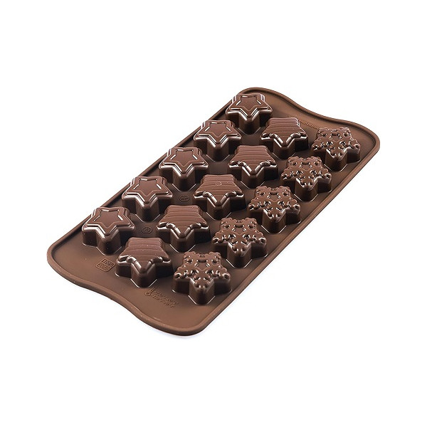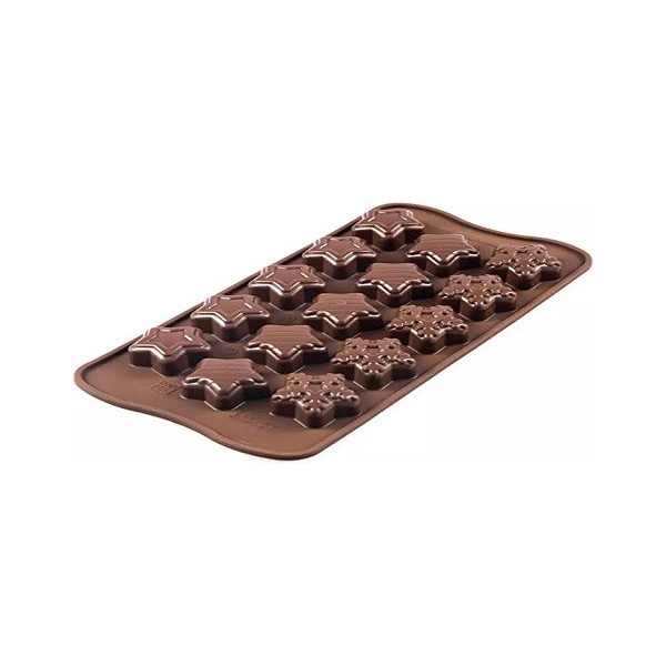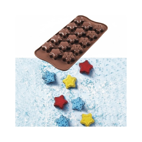 Choco Winter Star da Silikomart SCG45: stampo in silicone per 15 cioccolatini suddivisi in tre forme diverse di stelle, con decori a tema stella invernali o stelle natalizie