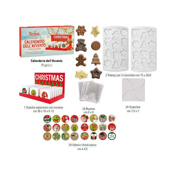 Realizza un originale calendario dell’Avvento fatto a mano con il kit completo Decora da 75 pezzi. Include stampi, scatoline e decorazioni per creare 24 deliziosi cioccolatini natalizi. Perfetto per laboratori di pasticceria, hobbisti e amanti del fai da te natalizio.
