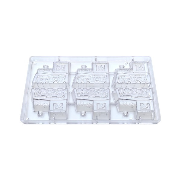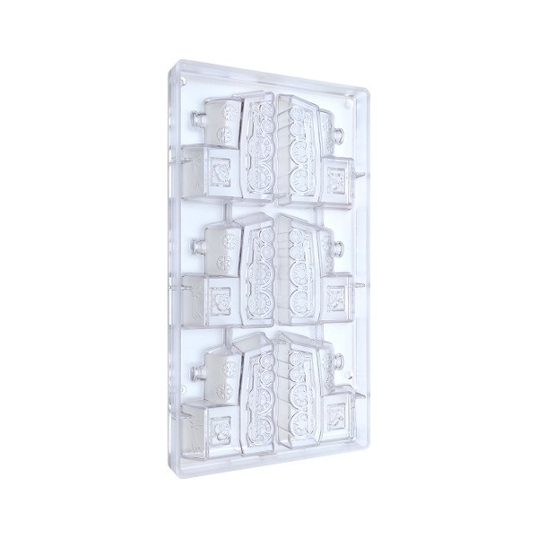 Stampo Tavolette di cioccolato 'Locomotiva con Babbo Natale': stampo in policarbonato professionale per 6 tavolette di cioccolato a tema natalizio da 80 g, 10,6x8 cm e spessore 3 mm.