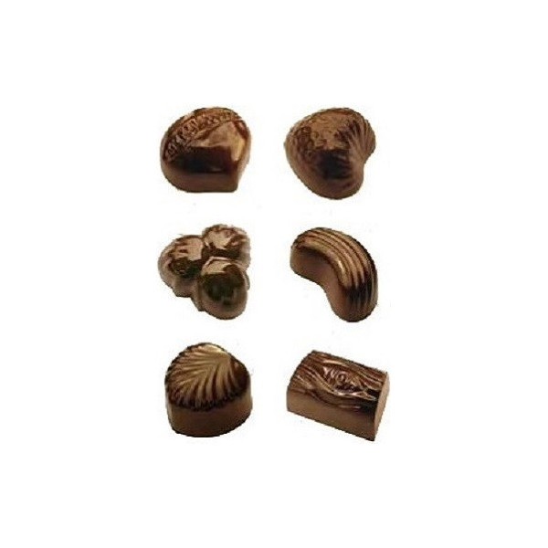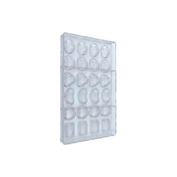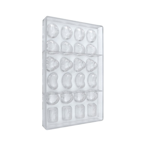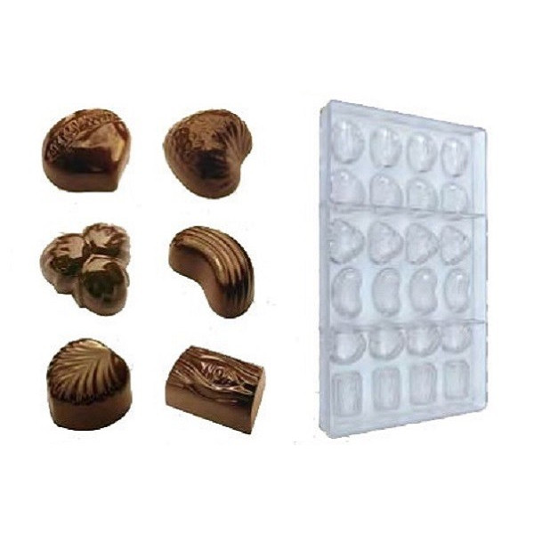 Cioccolatini misti da 10 g. Stampo in policarbonato per 24 cavità suddivise in forme assortite: cuore, noce, 3 nocciole, conchiglia, fiore, ideali per uso professionale