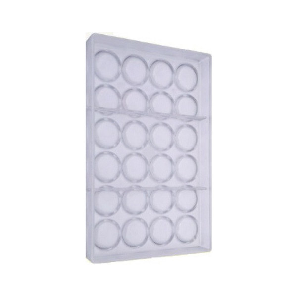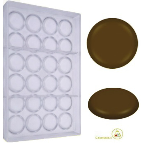 Stampo in policarbonato professionale vi permetterà di realizzare 24 cioccolatini a forma di cialda dal diametro di 36 mm x altezza 6 mm e peso 5,5 g nel modo più preciso.