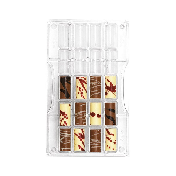 Stampo in policarbonato professionale vi permetterà di realizzare cioccolatini a forma di cilindri nel modo più preciso. Pratico da usare grazie alla forma brevettata dello stampo che permette la presa dello stampo con un unica mano.