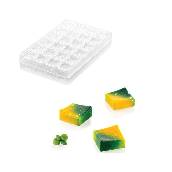 Con lo stampo Onda P Silikomart, hai 24 cavità a base quadrata di lato 2,85 cm ed alte 13 mm e volume 8 ml.