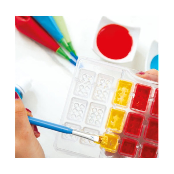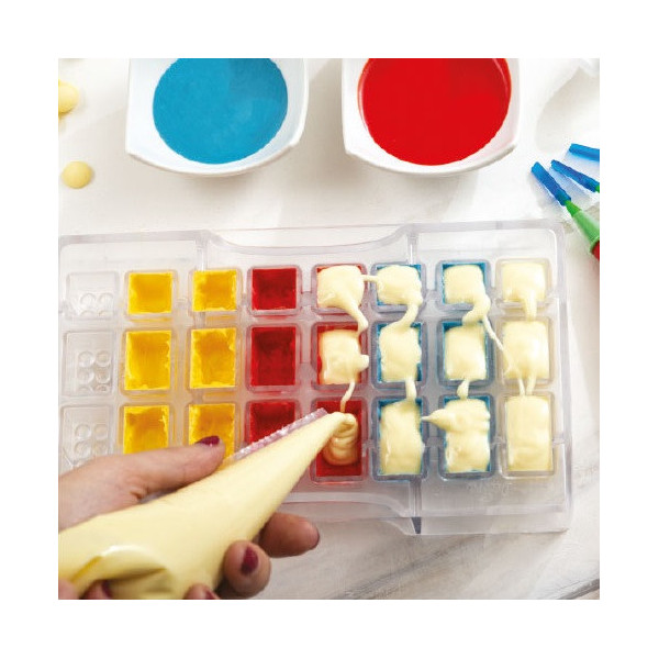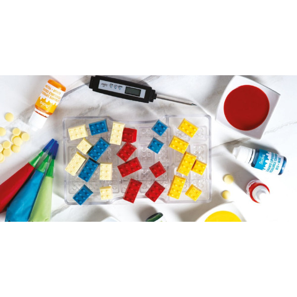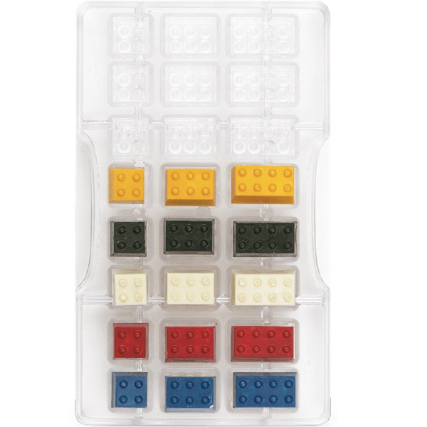 Stampo in policarbonato professionale vi permetterà di realizzare 24 cioccolatini a forma di mattoncini tipo lego nel modo più preciso. Pratico da usare grazie alla forma brevettata dello stampo che permette la presa dello stampo con un unica mano.