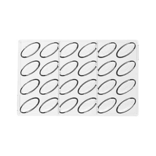 Stampo in Tritan per 24 praline di cioccolato, di dimensioni 46x19 h 14 mm e volume 8 ml, dalla forma affusolata, oblunga.