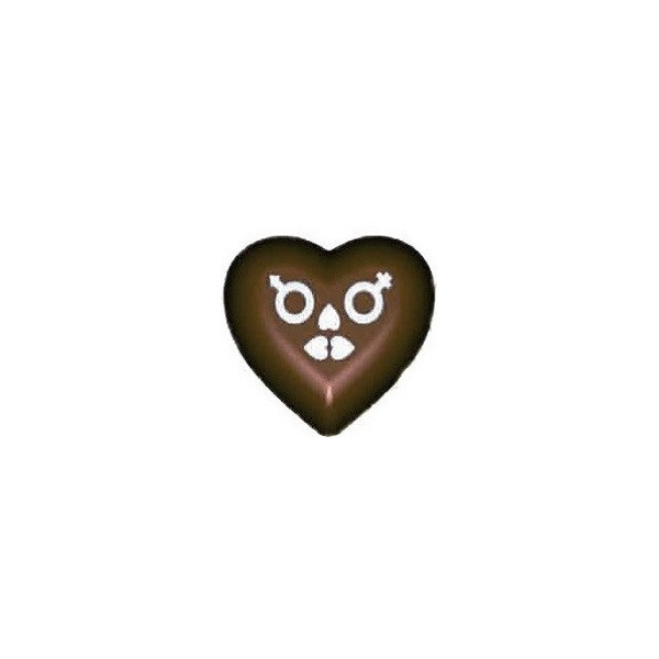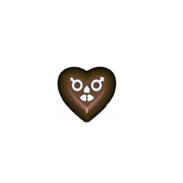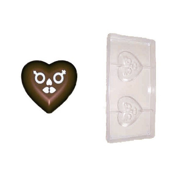 Stampo in policarbonato per 2 cuori cioccolato con decoro superficiale lui e lei di dimensioni 78,6X69,5 mm e di peso 40 g