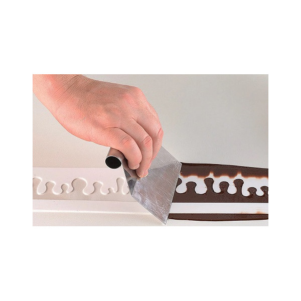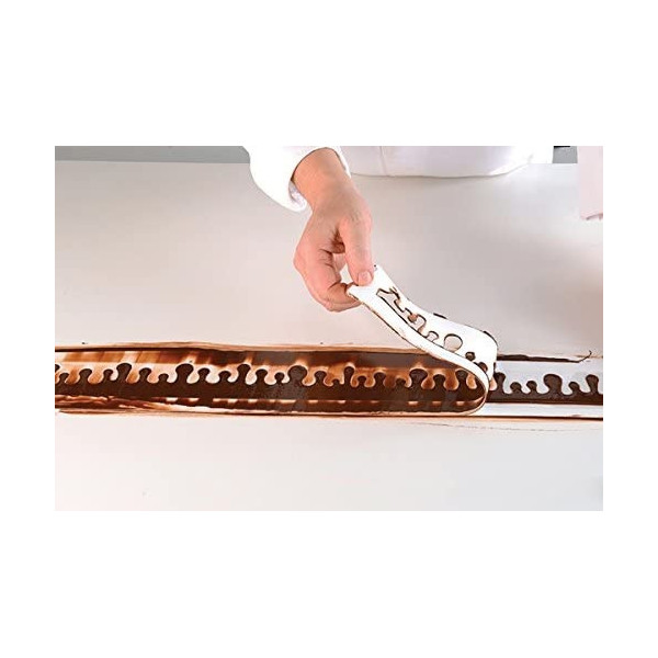 Sono inclusi nella confezione un rotolo di acetato 10 m x h 5 cm e una pratica spatola per allineare la fascia e stendere uniformemente il cioccolato.